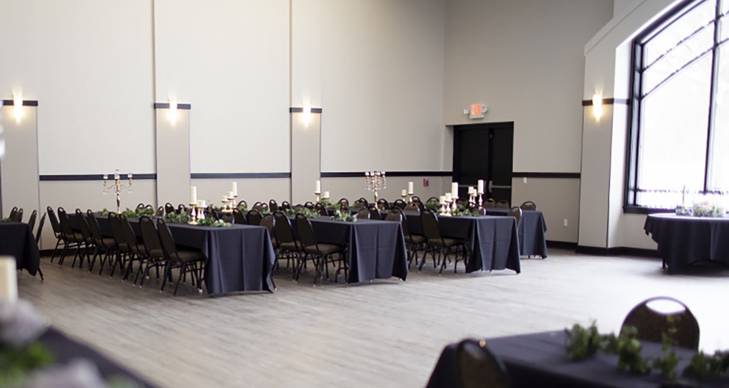 The Grand Community Room is the perfect place for your large gathering. This 2,300 sq. ft. room features an arched window overlooking the scenic patio and classic log cabin, built in 1864.