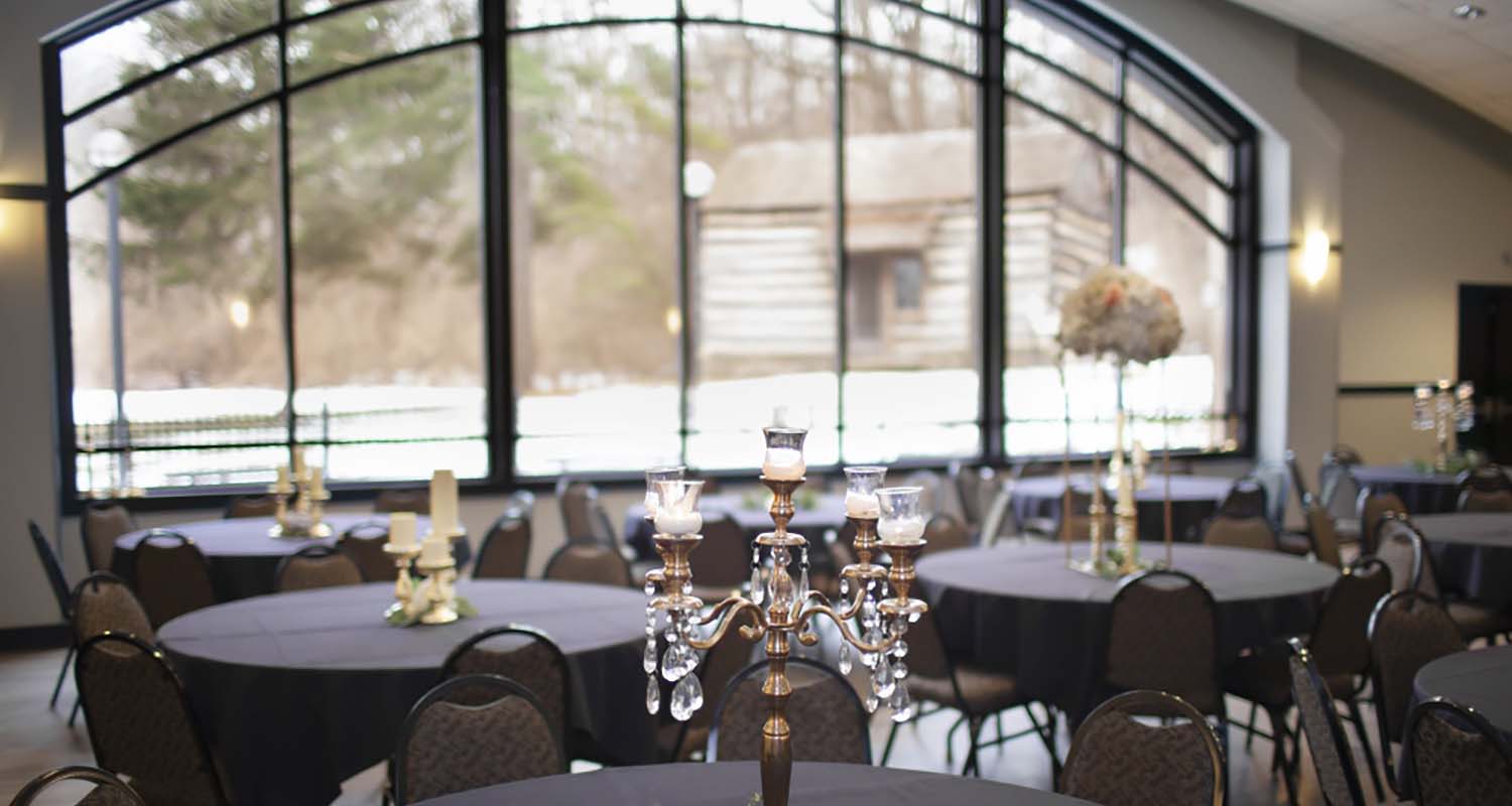 The Grand Community Room is the perfect place for your large gathering. This 2,300 sq. ft. room features an arched window overlooking the scenic patio and classic log cabin, built in 1864.